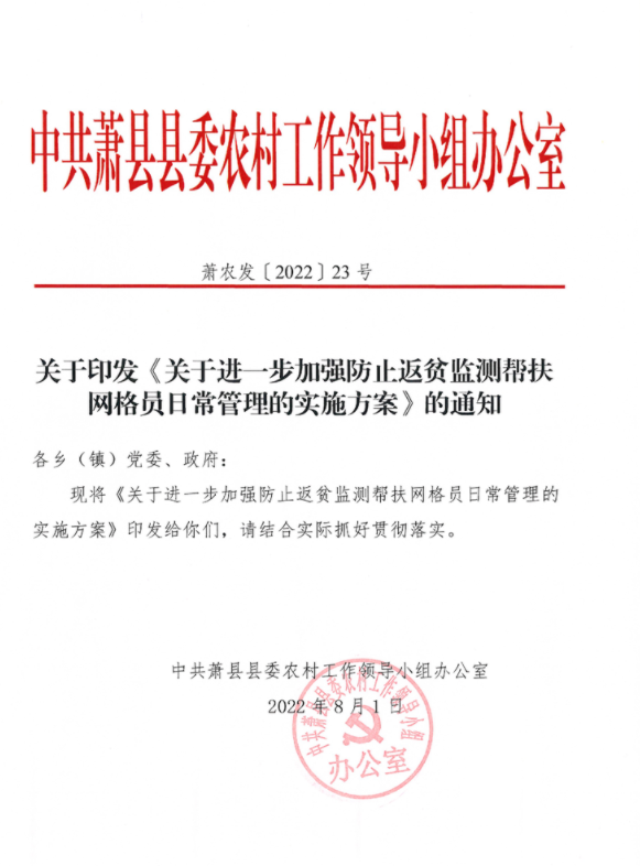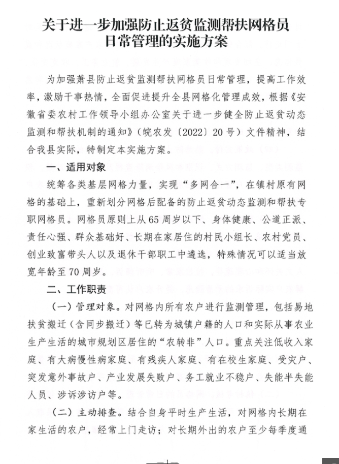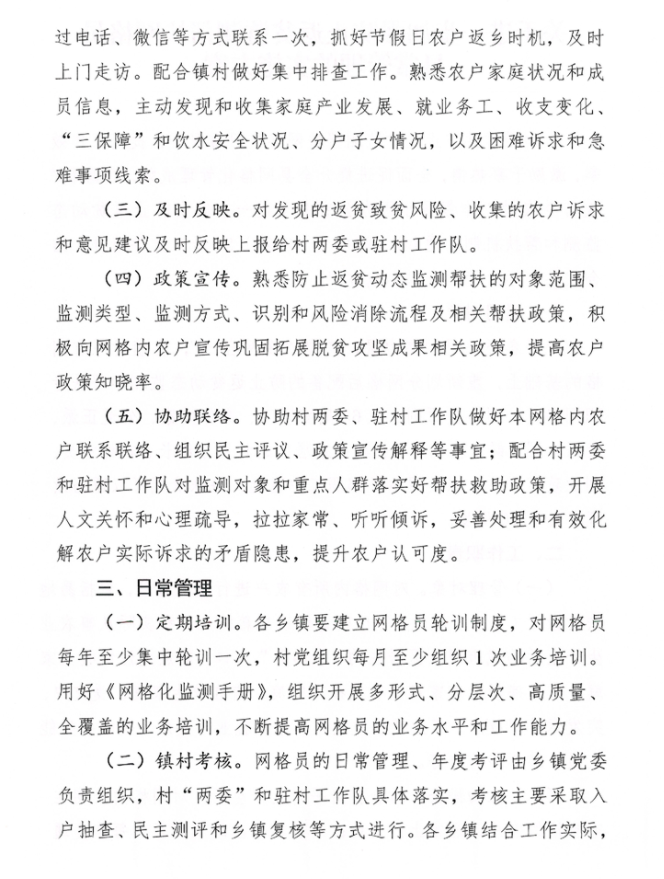 關(guān)于印發(fā)《關(guān)于進(jìn)一步加強(qiáng)防止返貧監(jiān)測(cè)幫扶網(wǎng)格員日常管理的實(shí)施方案》的通知
