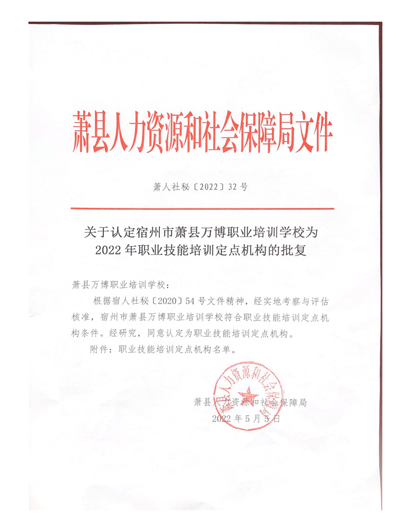 【職業(yè)培訓信息】關于認定蕭縣萬博職業(yè)培訓學校為定點培訓機構(gòu)及2022年蕭縣定點培訓機構(gòu)名單