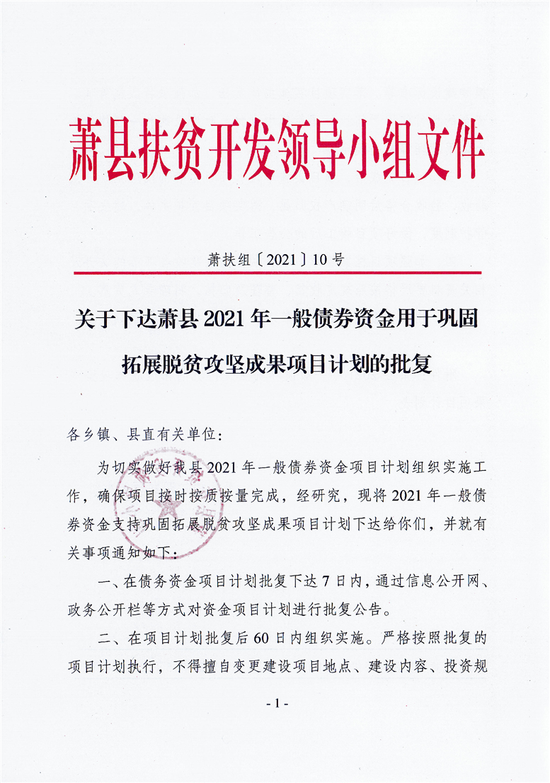 關(guān)于下達(dá)蕭縣2021年一般債券資金用于鞏固拓展脫貧攻堅(jiān)成果項(xiàng)目計(jì)劃的批復(fù)