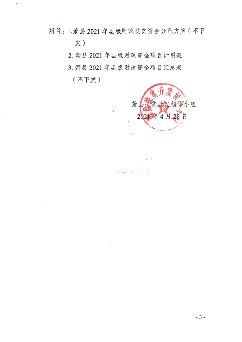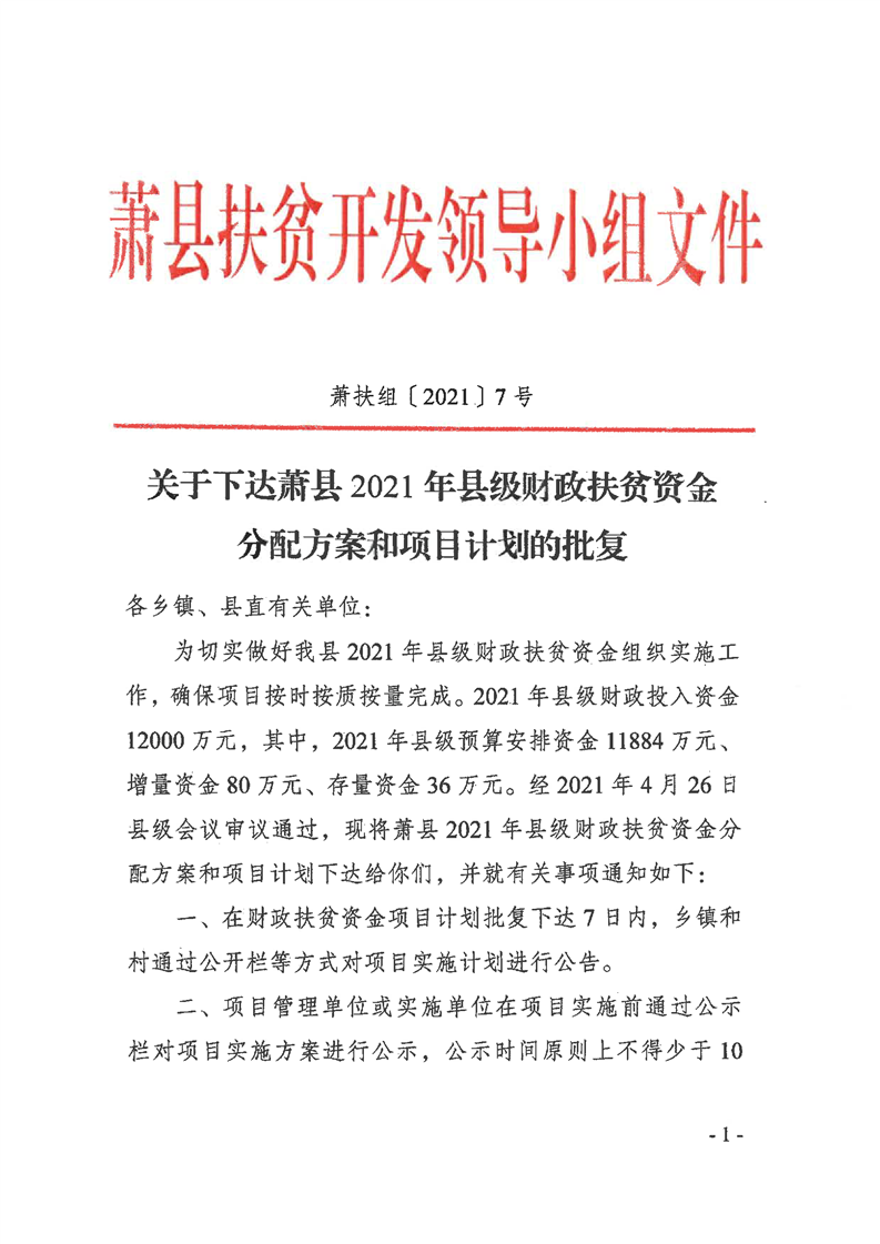 關于下達蕭縣2021年縣級財政扶貧資金分配方案和項目計劃的批復
