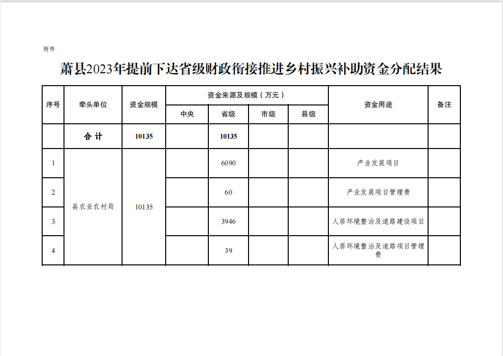 蕭縣2023年提前下達(dá)省級財(cái)政銜接推進(jìn)鄉(xiāng)村振興補(bǔ)助資金分配方案已經(jīng)縣委農(nóng)村工作領(lǐng)導(dǎo)小組會(huì)議審定、批復(fù)下達(dá),參照原安徽省扶貧辦、安徽省財(cái)政廳《關(guān)于完善扶貧項(xiàng)目資金公告公示制度的實(shí)施意見》(皖扶辦〔2018〕118號)精神,現(xiàn)將資金分配結(jié)果公告如下: