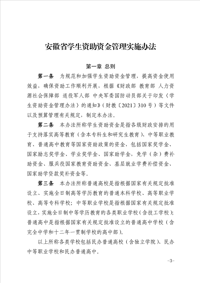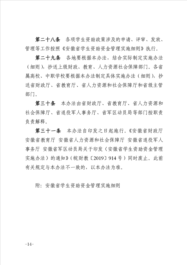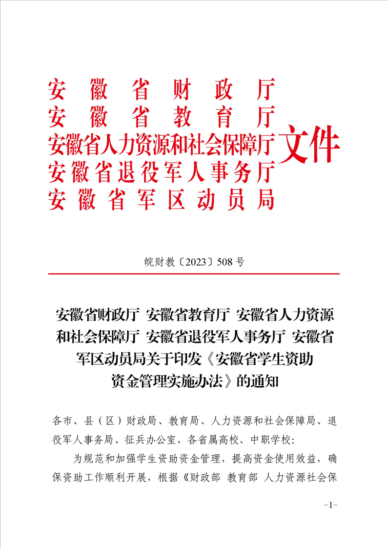 【資助政策】安徽省財政廳、安徽省教育廳、安徽省人力資源和社會保障廳、安徽省退役軍人事務(wù)廳、安徽省軍區(qū)動員局關(guān)于印發(fā)《安徽省學(xué)生資助資金管理實施辦法》的通知