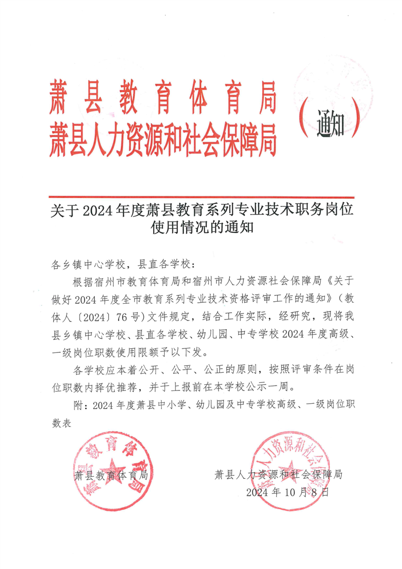【評(píng)審?fù)ㄖ筷P(guān)于2024年度蕭縣教育系列專業(yè)技術(shù)職務(wù)崗位使用情況的通知