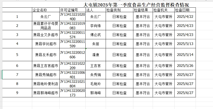 大屯鎮(zhèn)2025年第二季度食品生產(chǎn)經(jīng)營(yíng)監(jiān)督檢查情況
