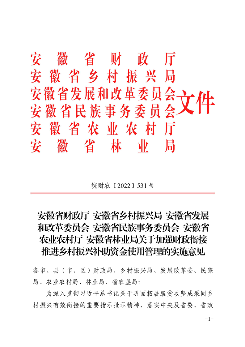 (省級)關(guān)于加強(qiáng)財政銜接推進(jìn)鄉(xiāng)村振興補(bǔ)助資金使用管理的實施意見(皖財農(nóng)〔2022〕531號)
