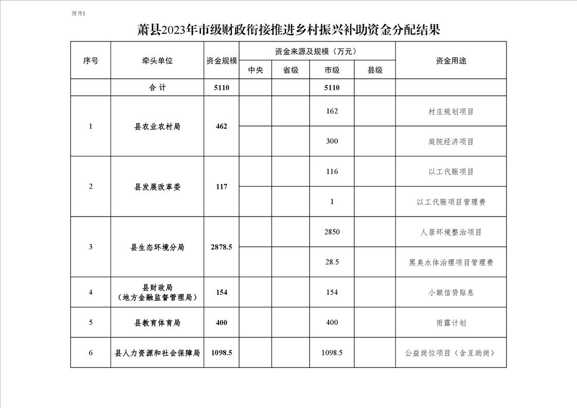 蕭縣2023年市級財政銜接推進鄉(xiāng)村振興補助資金分配方案已經(jīng)縣委農(nóng)村工作領導小組會議審定、批復下達,參照原安徽省扶貧辦、安徽省財政廳《關于完善扶貧項目資金公告公示制度的實施意見》(皖扶辦〔2018〕118號)精神,現(xiàn)將資金分配結果公告如下: