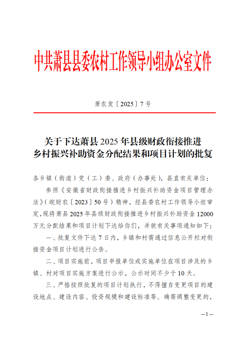 關(guān)于下達(dá)蕭縣2025年縣級(jí)財(cái)政銜接推進(jìn)鄉(xiāng)村振興補(bǔ)助資金分配結(jié)果和項(xiàng)目計(jì)劃的批復(fù)