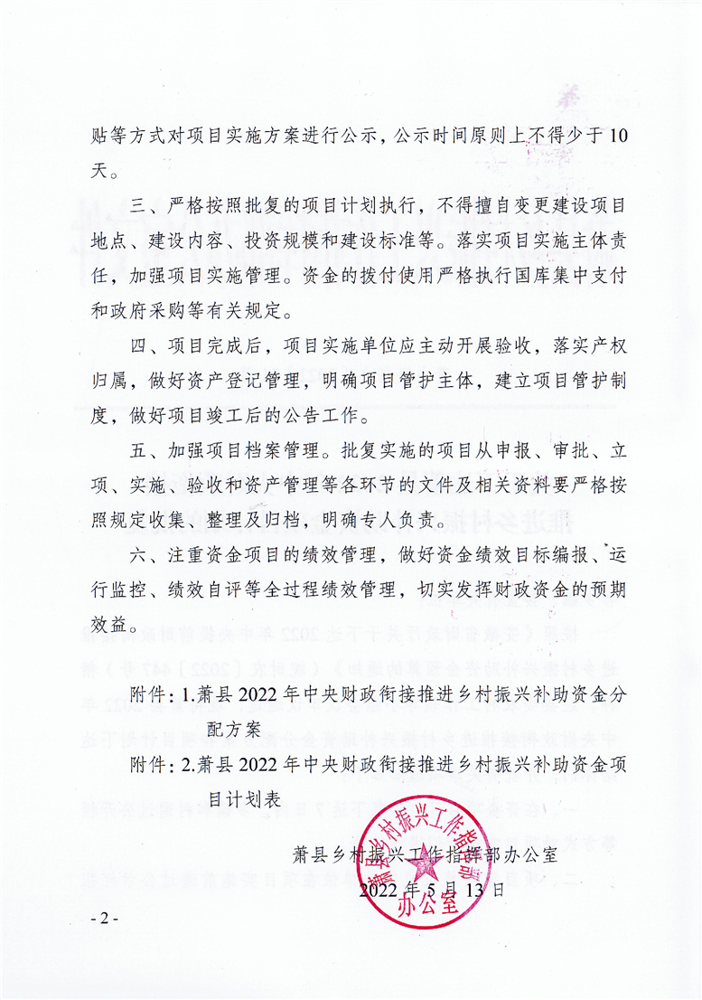 關于下達蕭縣2022年中央財政銜接推進鄉(xiāng)村振興補助資金項目計劃的批復