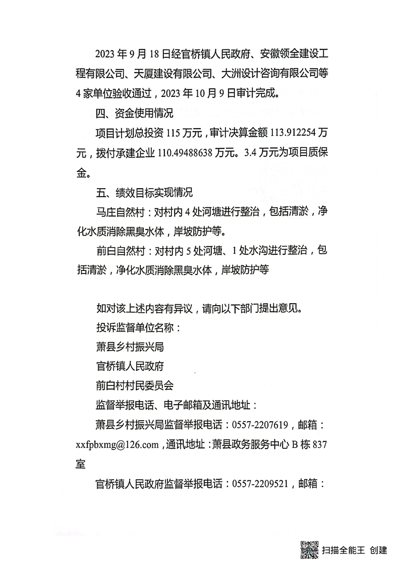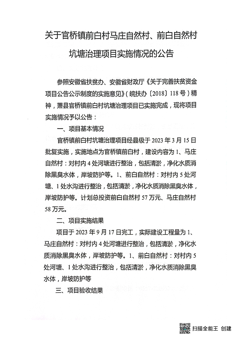 【計劃完成情況】官橋鎮(zhèn)前白行政村馬莊自然村、前白自然村坑塘治理項目實施情況的公告