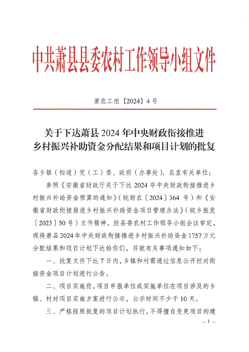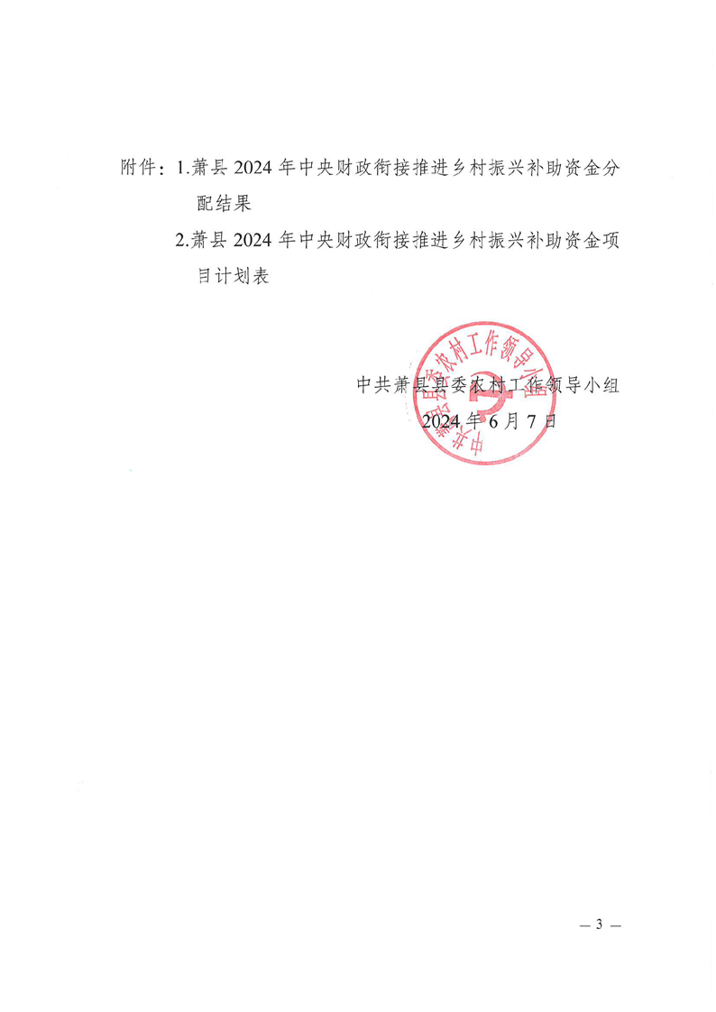 【計劃安排情況】官橋鎮(zhèn)-關(guān)于下達蕭縣2024年中央財政銜接推進鄉(xiāng)村振興補助資金分配結(jié)果和項目計劃的批復