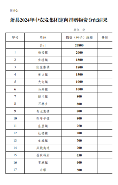 蕭縣2024年中農(nóng)發(fā)集團(tuán)定向捐贈(zèng)資金(物資)分配方案已經(jīng)縣委農(nóng)村工作領(lǐng)導(dǎo)小組會(huì)議審定、批復(fù)下達(dá),現(xiàn)將資金(物資)分配結(jié)果公告如下: