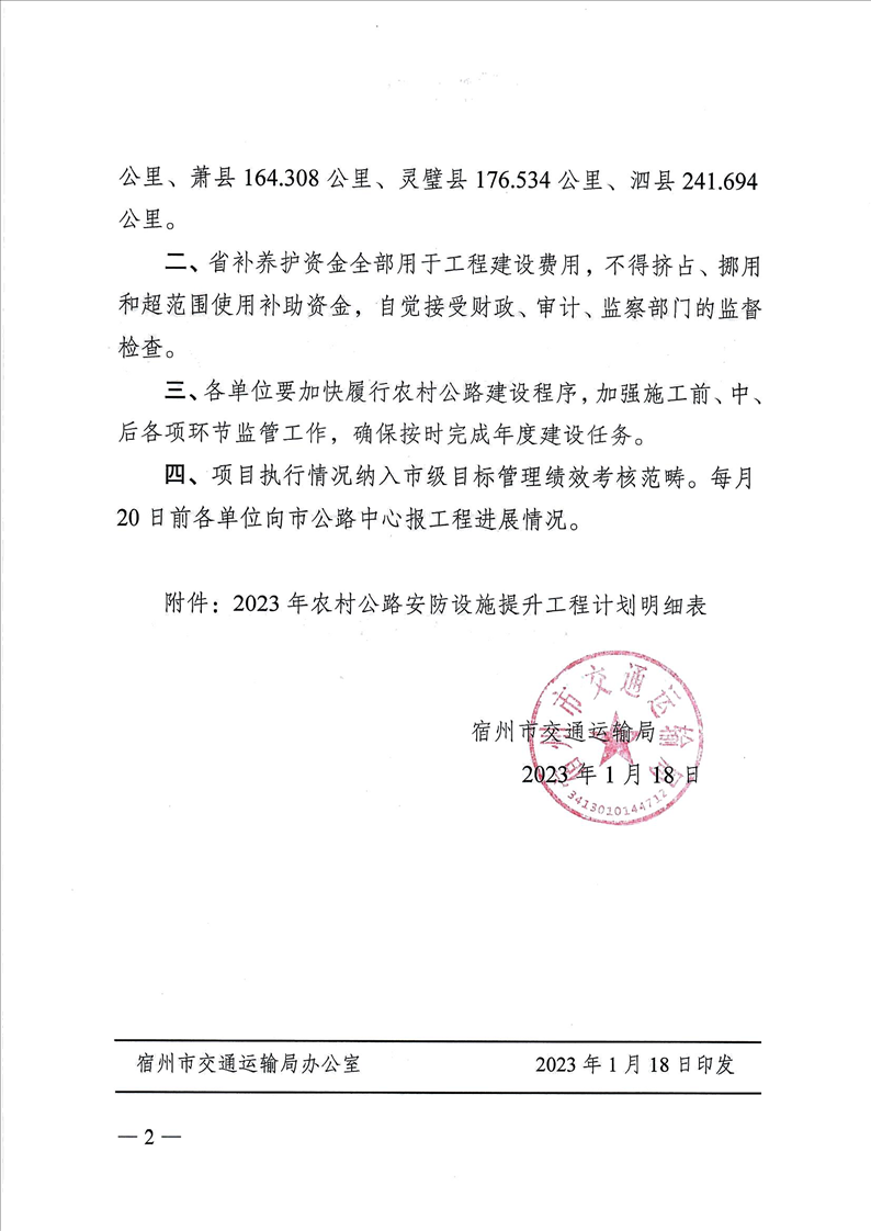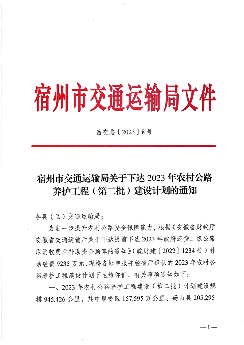 宿州市交通運(yùn)輸局關(guān)于下達(dá)2023年農(nóng)村公路養(yǎng)護(hù)工程(第二批)建設(shè)計劃的通知