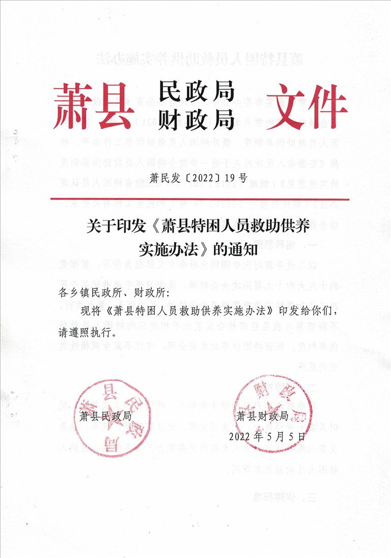 【政策文件】關(guān)于印發(fā)《蕭縣特困人員救助供養(yǎng)實(shí)施辦法》的通知(蕭民發(fā)【2022】19號(hào))
