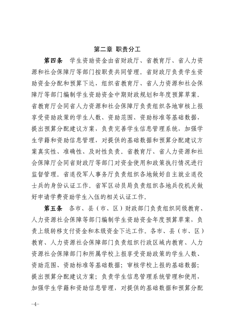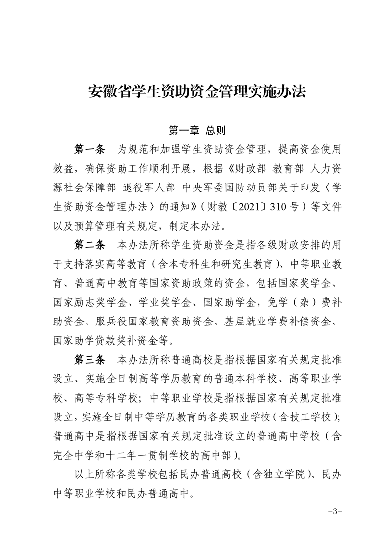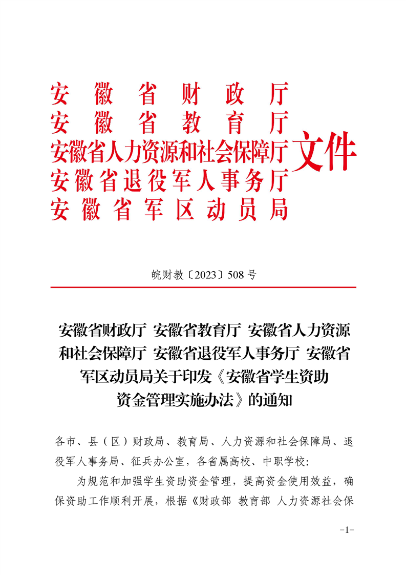 【資助政策】安徽省財(cái)政廳、安徽省教育廳、安徽省人力資源和社會(huì)保障廳、安徽省退役軍人事務(wù)廳、安徽省軍區(qū)動(dòng)員局關(guān)于印發(fā)《安徽省學(xué)生資助資金管理實(shí)施辦法》的通知