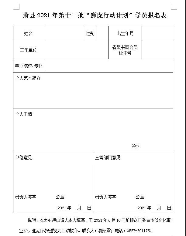 為進一步繁榮和發(fā)展蕭縣書畫事業(yè),提升“書畫藝術(shù)之鄉(xiāng)”的影響力和美譽度,大力培養(yǎng)書畫優(yōu)秀人才,不斷提升我縣書畫藝術(shù)品位,擴大我縣書畫藝術(shù)的影響力,促進蕭縣書畫藝術(shù)人才脫穎而出,2021年縣委、縣政府繼續(xù)實施書畫“獅虎行動計劃”,縣委宣傳部按照要求面向社會公開選拔書畫優(yōu)秀人才,輸送到國家級藝術(shù)院校學(xué)習(xí)深造。