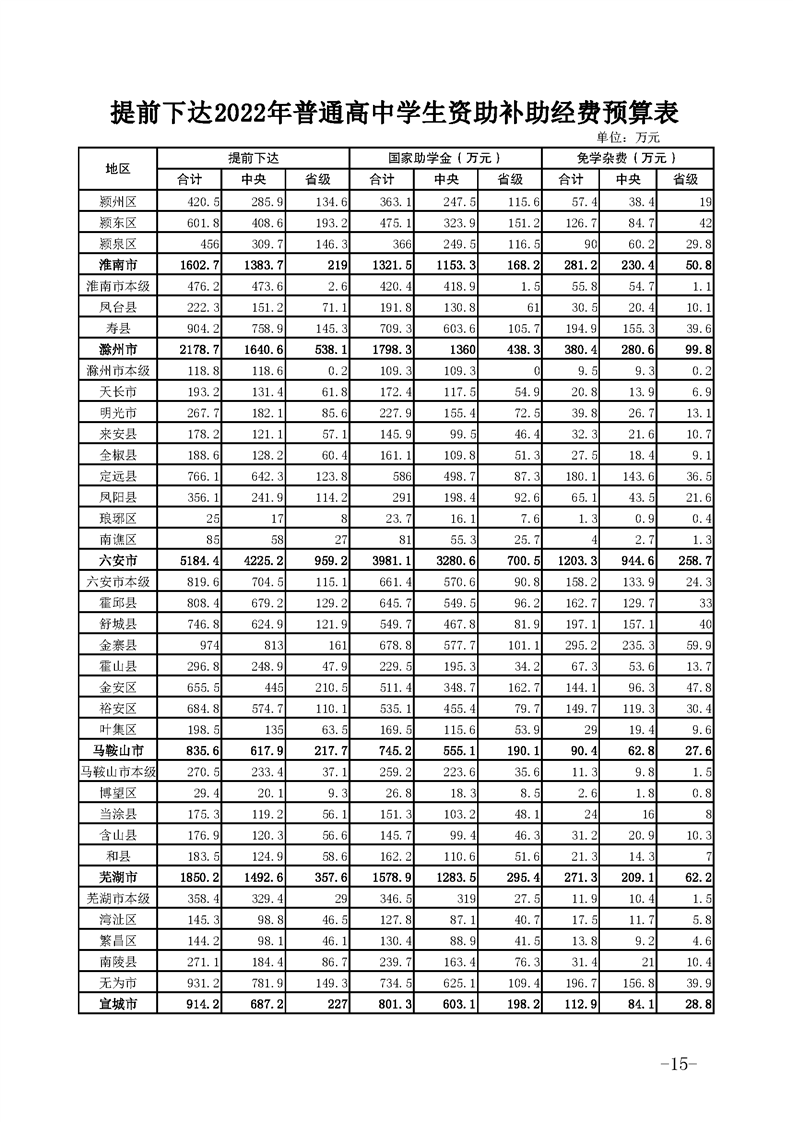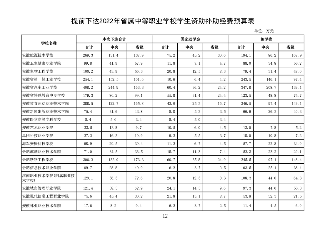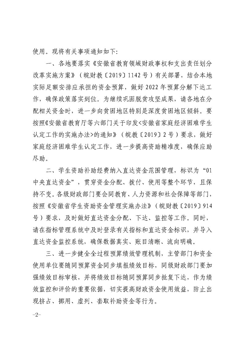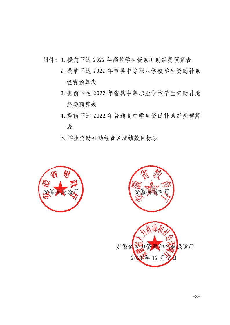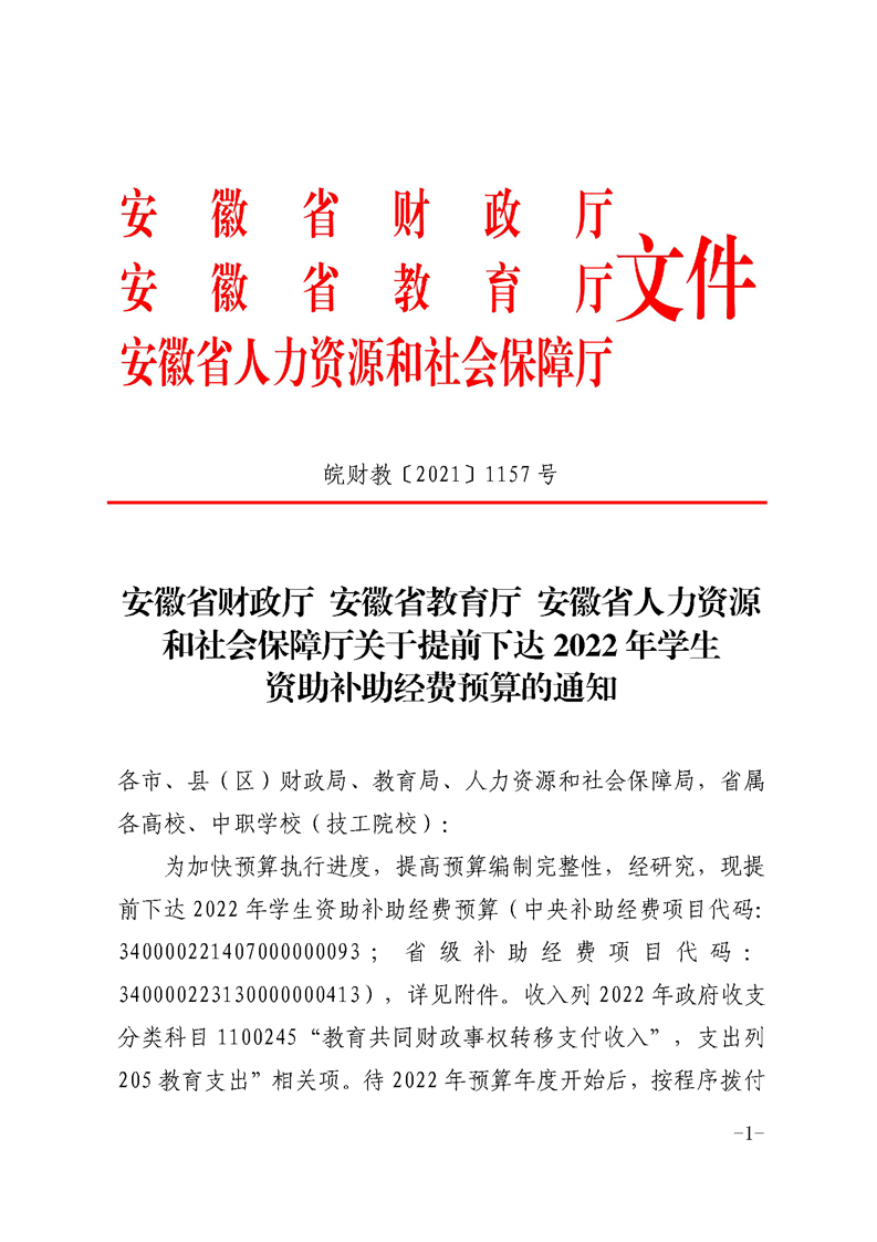 安徽省財政廳安徽省教育廳安徽省人力資源和社會保障廳關(guān)于提前下達2022年學(xué)生資助補助經(jīng)費預(yù)算的通知