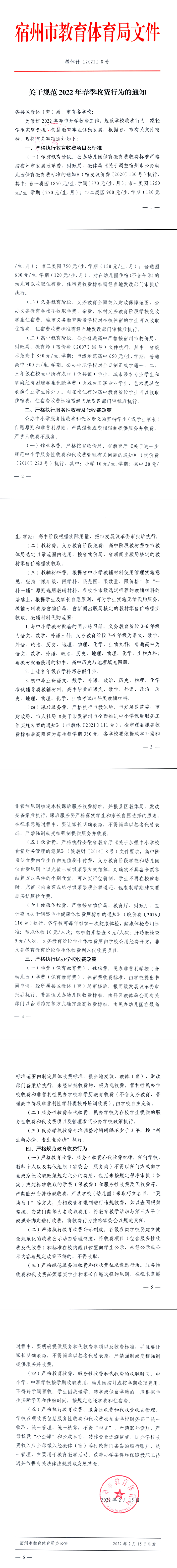 【收費(fèi)項(xiàng)目及收費(fèi)標(biāo)準(zhǔn)】宿州市教育體育局關(guān)于規(guī)范2022年春季收費(fèi)行為的通知