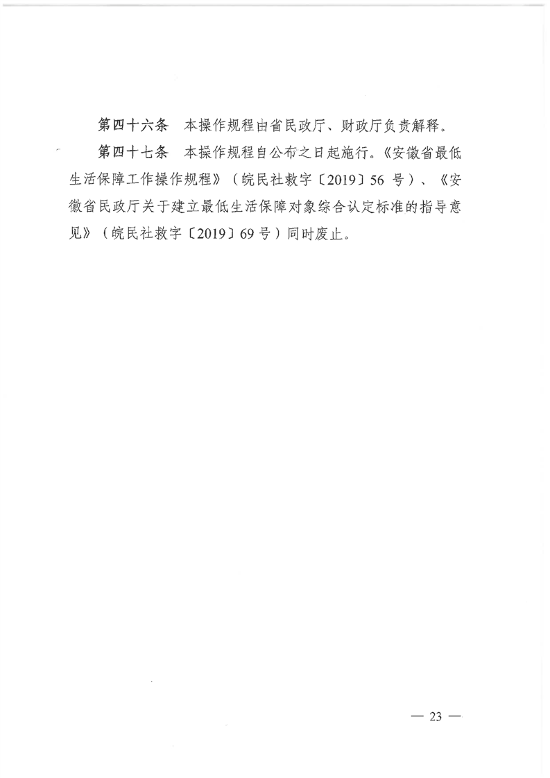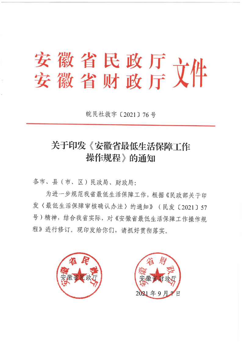 關(guān)于印發(fā)《安徽省最低生活保障工作操作規(guī)程》的通知(皖民社救字〔2021〕76號)