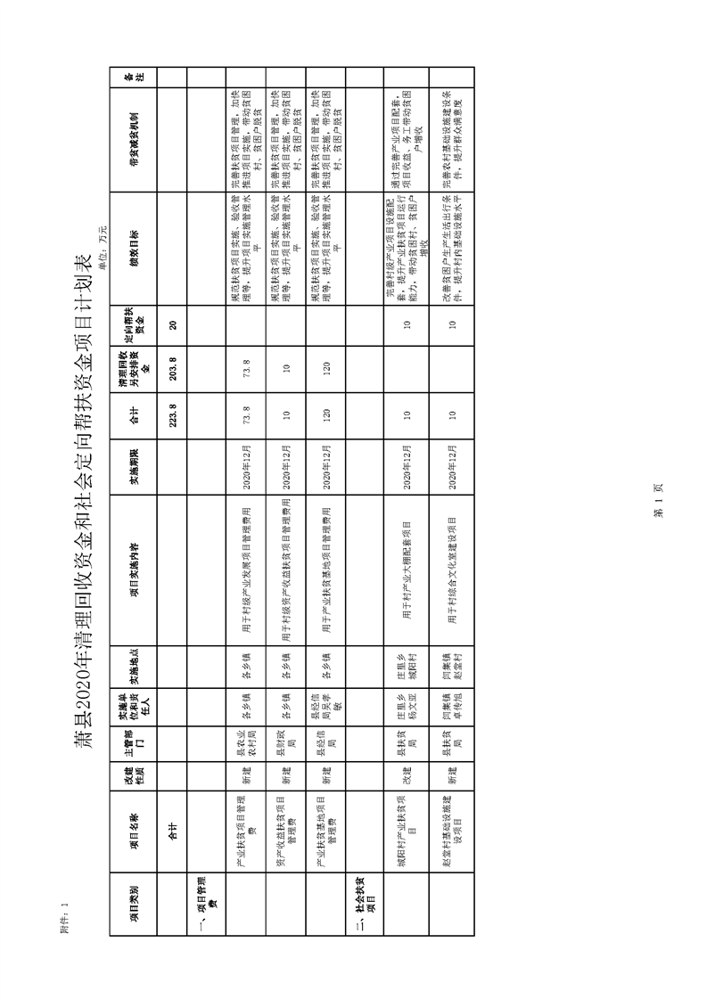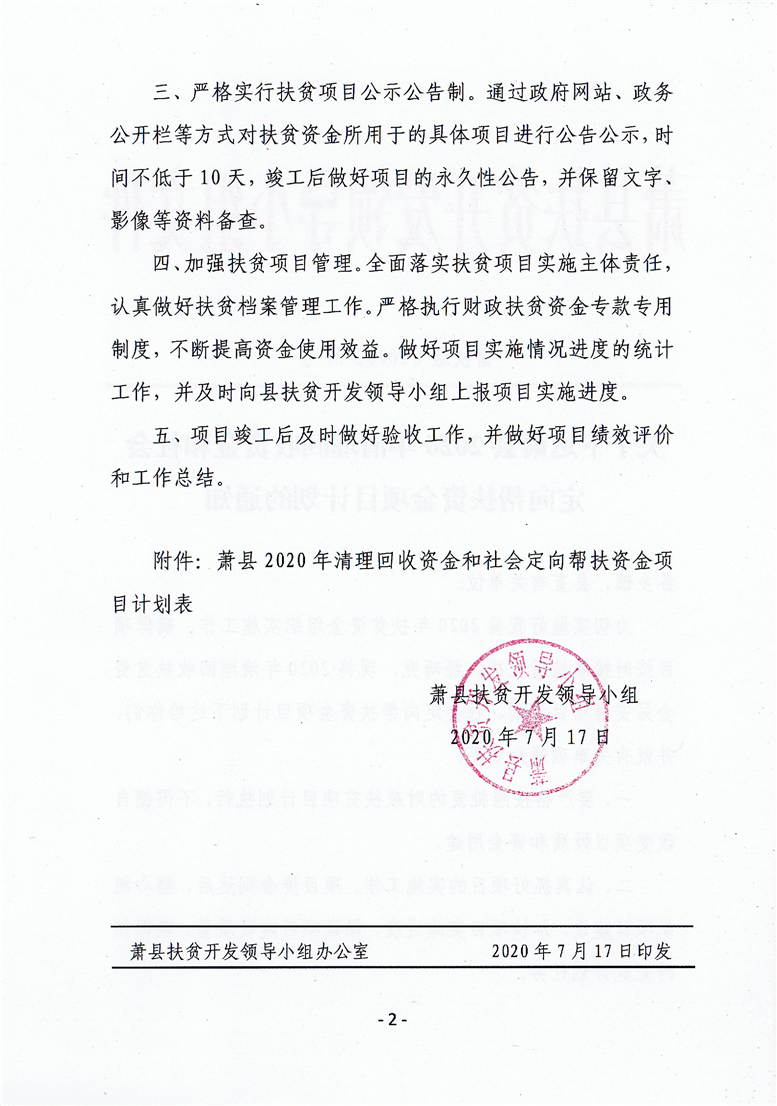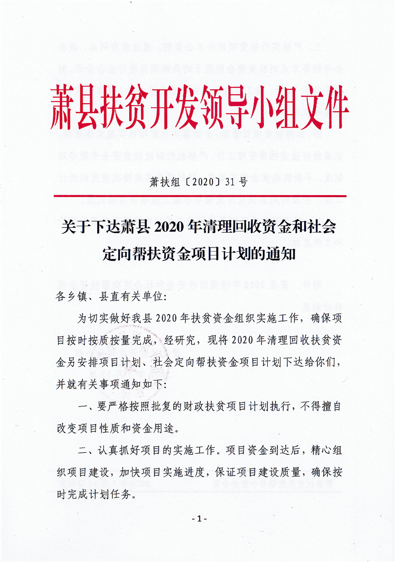 關(guān)于下達蕭縣2020年清理回收資金和社會定向幫扶資金項目計劃的通知(蕭扶組〔2020〕31號)