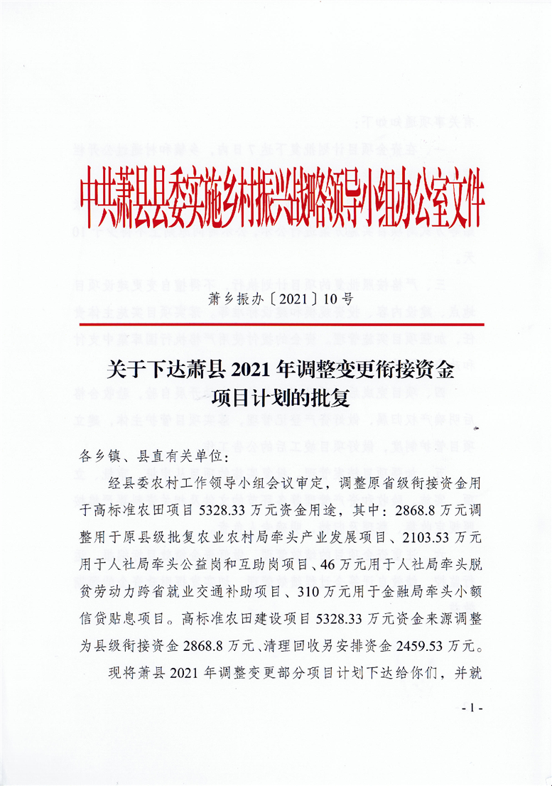 關(guān)于下達(dá)蕭縣2021年調(diào)整變更銜接資金項(xiàng)目計(jì)劃的批復(fù)