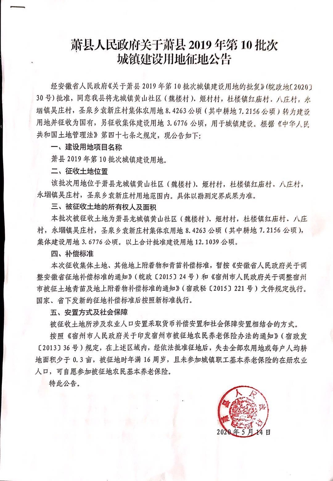 蕭縣2019年第10批次城鎮(zhèn)建設(shè)用地征地公告