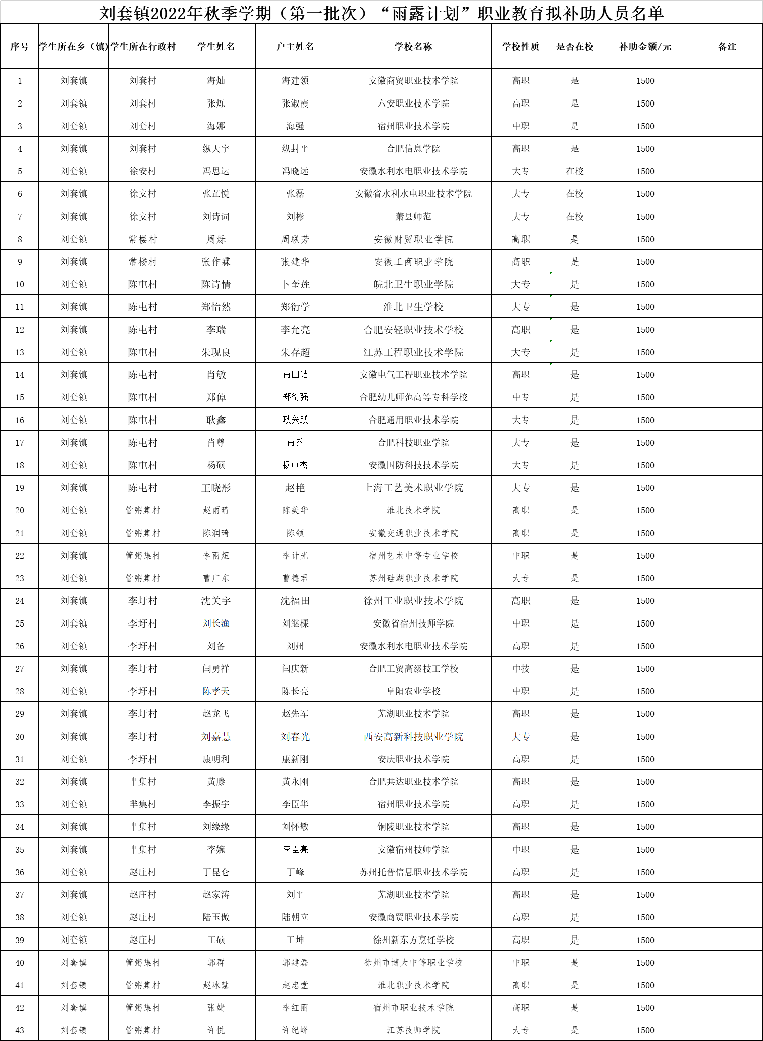 劉套鎮(zhèn)2022年秋季學(xué)期(第一批次)“雨露計(jì)劃”職業(yè)教育擬補(bǔ)助人員名單