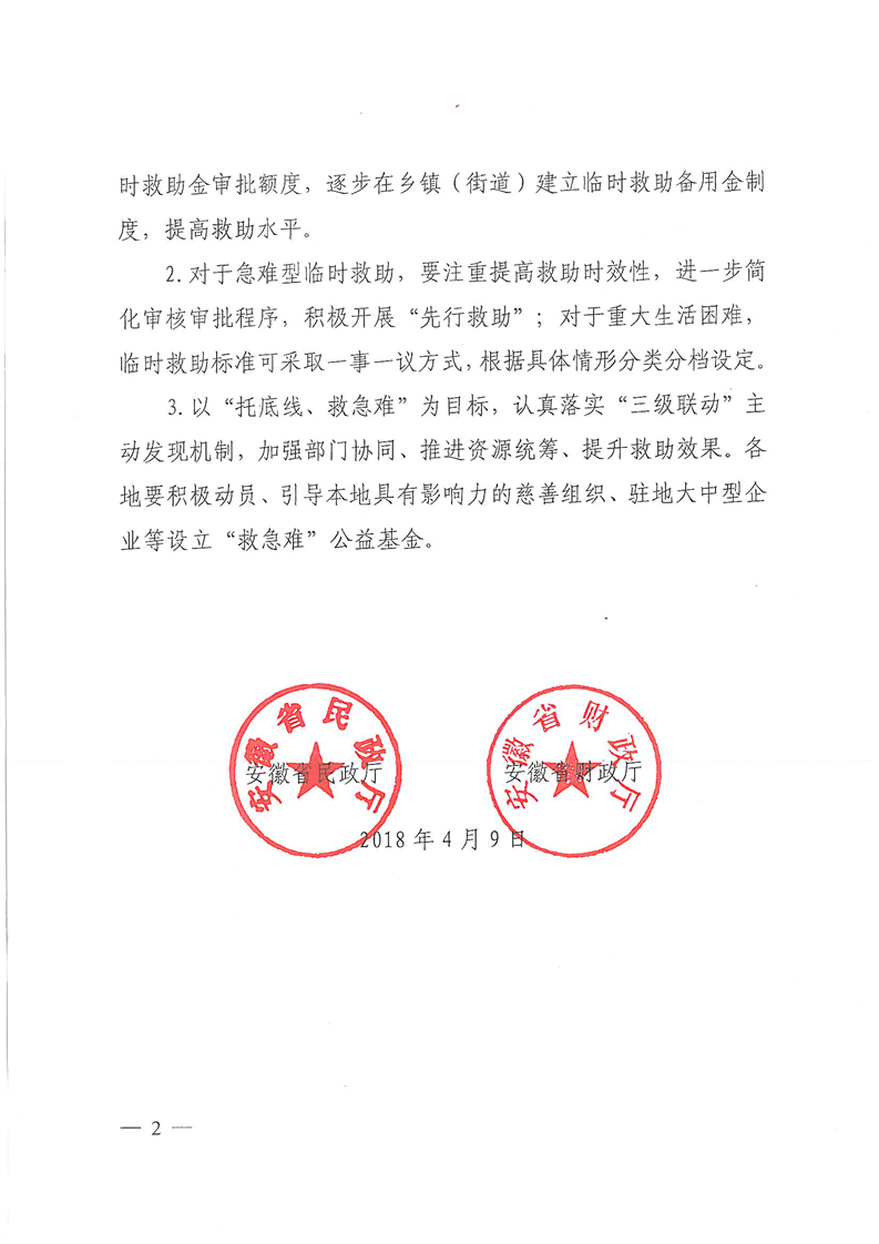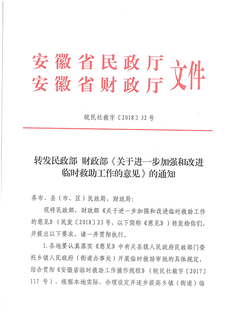 安徽省民政廳財政廳《轉發(fā)民政部財政部<關于進一步加強和改進臨時救助工作的意見>的通知》(皖民社救字〔2018〕32號)