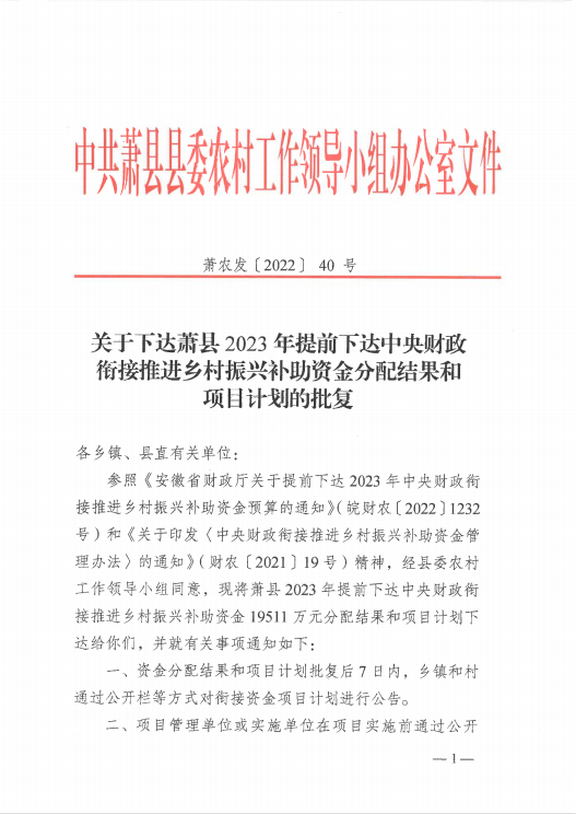 【龍城鎮(zhèn)】關(guān)于下達(dá)蕭縣2023年提前下達(dá)中央財政銜接推進(jìn)鄉(xiāng)村振興補助資金分配結(jié)果和項目計劃的批復(fù)(蕭農(nóng)發(fā)〔2022〕40號)