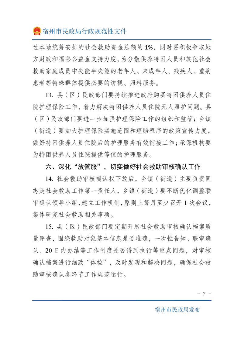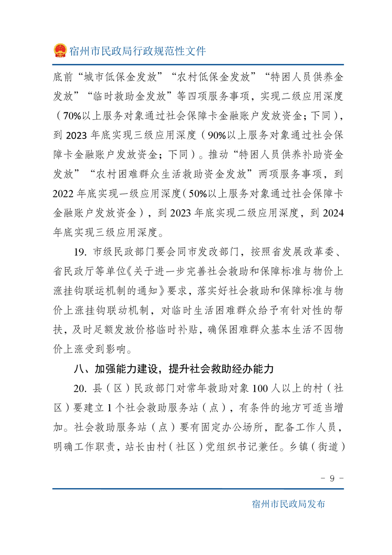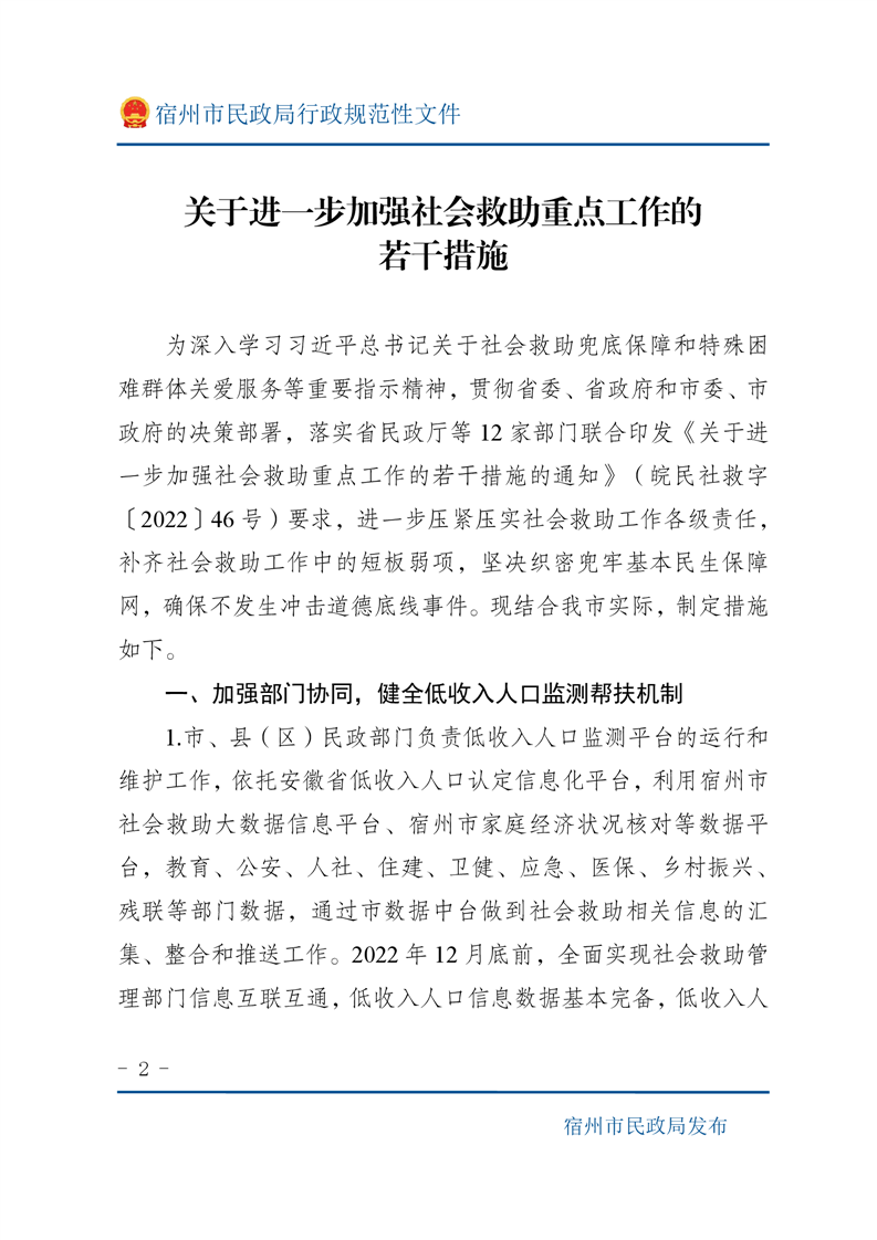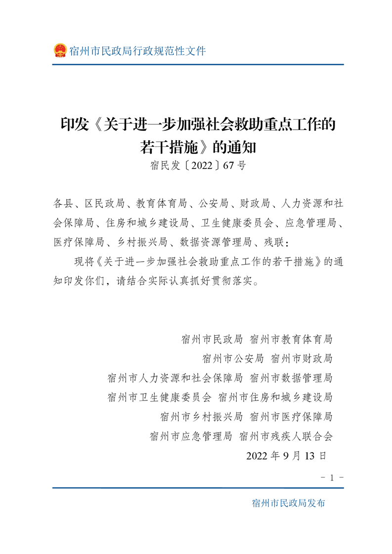 《宿州市民政局印發(fā)《關(guān)于進一步加強社會救助重點工作的若干措施》的通知》(宿民發(fā)〔2022〕67號)