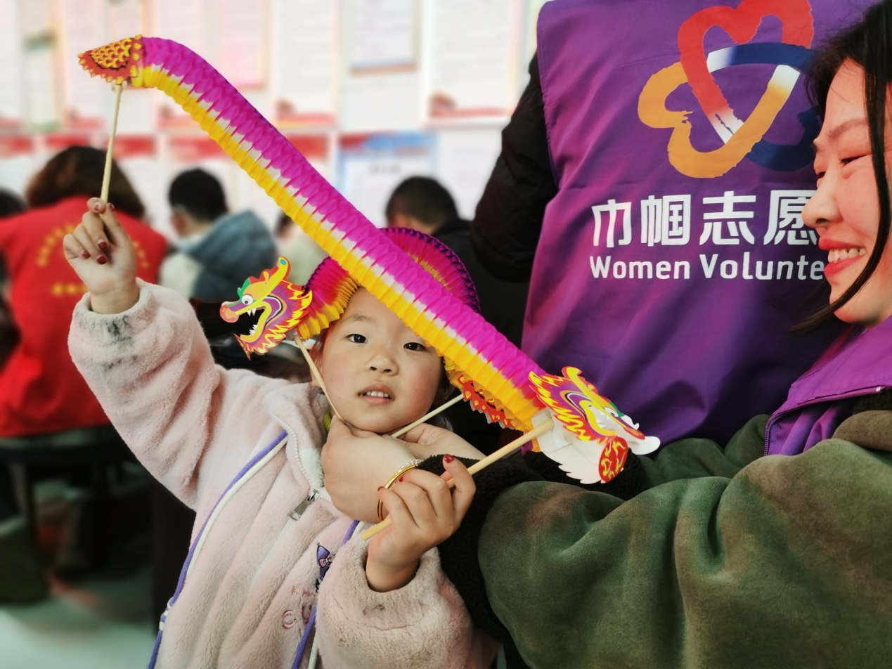 活動(dòng)現(xiàn)場(chǎng)孩子們?cè)谖幕驹刚叩闹笇?dǎo)下,家長陪同孩子一起動(dòng)手制作,有的一邊折疊一邊認(rèn)真琢磨,有的興奮交流制作方法,有的孩子一起分享制作成果。大家剪制、黏貼共同體驗(yàn)傳統(tǒng)手工制作的樂趣,感受傳統(tǒng)手工年味的魅力,體味節(jié)日的快樂。孩子們一邊做手工,一邊聽志愿者講解元宵節(jié)的由來和習(xí)俗,現(xiàn)場(chǎng)熱鬧而溫馨,一會(huì)功夫孩子們靈巧的雙手便把彩紙變成了一個(gè)個(gè)活靈活現(xiàn)熱鬧喜慶的小舞龍,并有模有樣的在手里耍玩舞弄,孩子們欣賞著自己的勞動(dòng)成果,臉上洋溢著快樂與滿足。