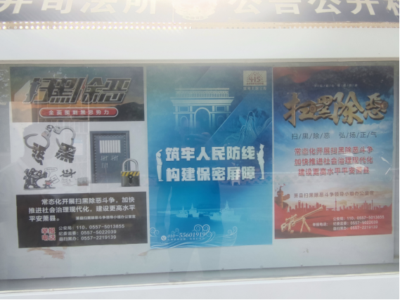 2、為進(jìn)一步加強(qiáng)掃黑除惡的宣傳力度,建設(shè)更高水平平安蕭縣,2023年8月20日,在鎮(zhèn)區(qū)開展掃黑除惡宣傳活動(dòng),張貼宣傳海報(bào)20張。