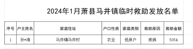 【臨時(shí)救助】2024年1月蕭縣馬井鎮(zhèn)臨時(shí)救助發(fā)放名單