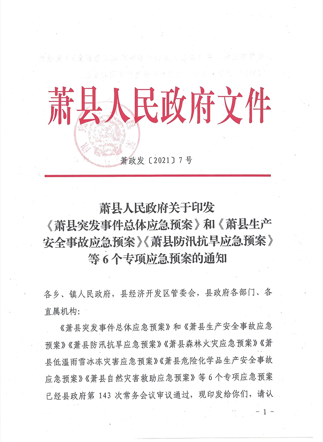 蕭縣人民政府關(guān)于印發(fā)《蕭縣突發(fā)事件總體應(yīng)急預(yù)案》和《蕭縣生產(chǎn)安全事故應(yīng)急預(yù)案》《蕭縣防汛抗旱應(yīng)急預(yù)案》等6個(gè)專項(xiàng)應(yīng)急預(yù)案的通知