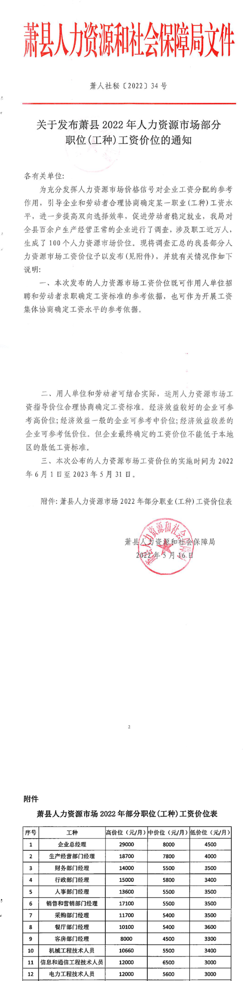 【市場(chǎng)工資指導(dǎo)價(jià)位信息】關(guān)于發(fā)布蕭縣2022年人力資源市場(chǎng)部分職位(工種)工資指導(dǎo)價(jià)位的通知