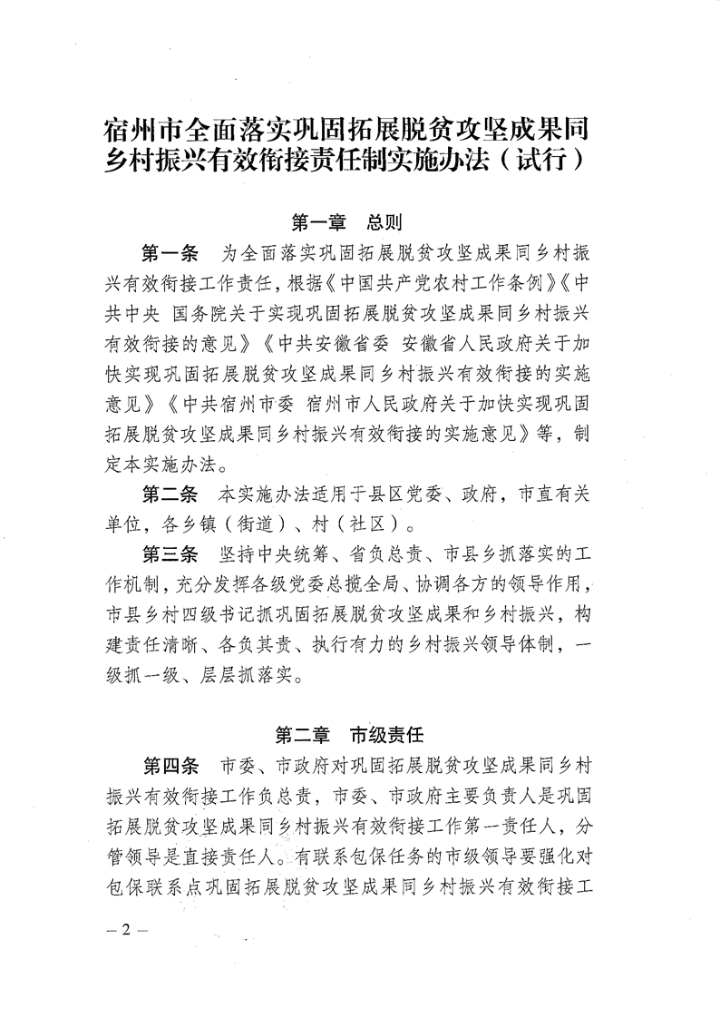 中共宿州市委實施鄉(xiāng)村振興戰(zhàn)略領(lǐng)導(dǎo)小組關(guān)于印發(fā)《宿州市全面落實鞏固拓展脫貧攻堅成果同鄉(xiāng)村振興有效銜接責任制實施辦法(試行)》的通知