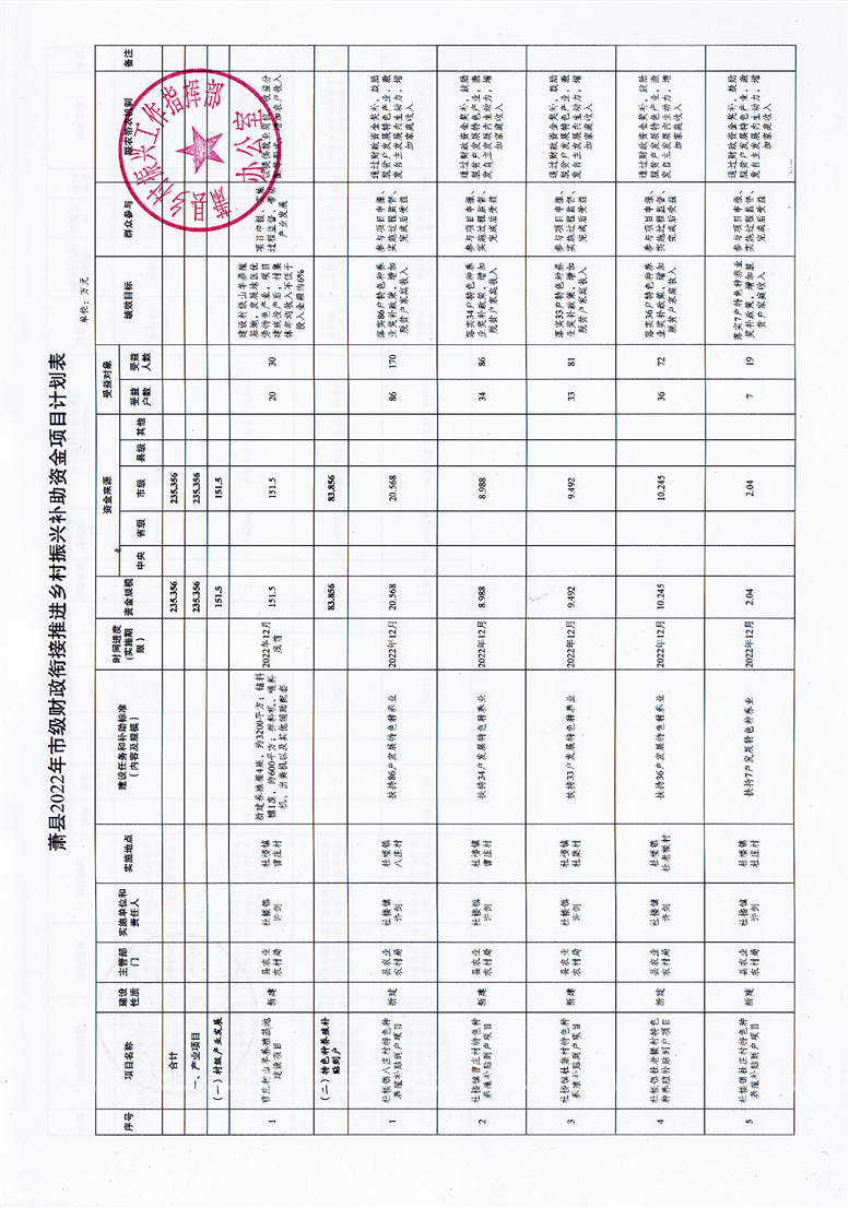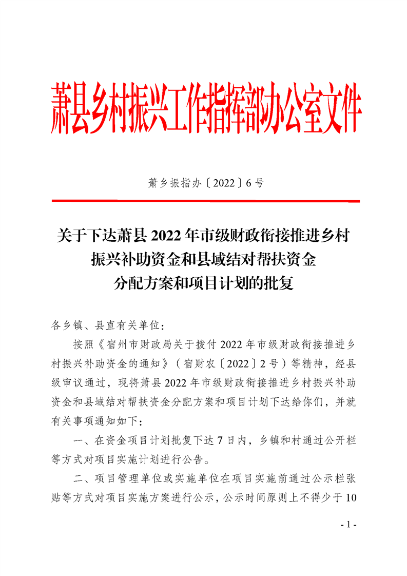 關(guān)于下達蕭縣2022年市級財政銜接推進鄉(xiāng)村振興補助資金和縣域結(jié)對幫扶資金分配方案和項目計劃的批復(fù)