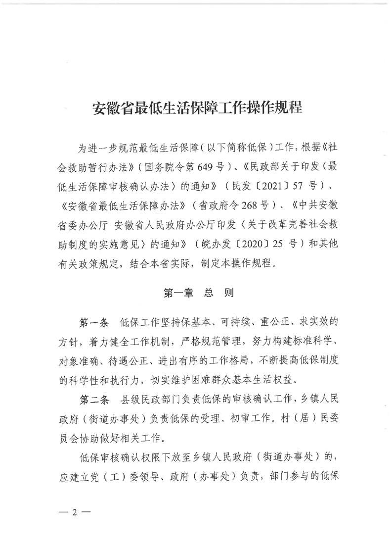 關(guān)于印發(fā)《安徽省最低生活保障工作操作規(guī)程》的通知(皖民社救字〔2021〕76號)