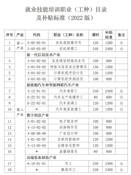(1)培訓機構補貼:按照省級工種目錄及補貼標準執(zhí)行(詳見下表就業(yè)技能培訓職業(yè)(工種)目錄及補貼標準(2022版)