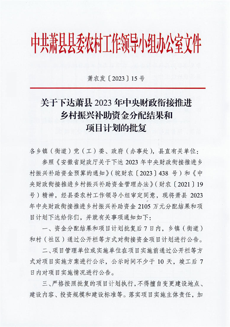 關(guān)于蕭縣2023年中央財政銜接推進(jìn)鄉(xiāng)村振興補助資金分配結(jié)果的公告和項目計劃的批復(fù)(崗子村)