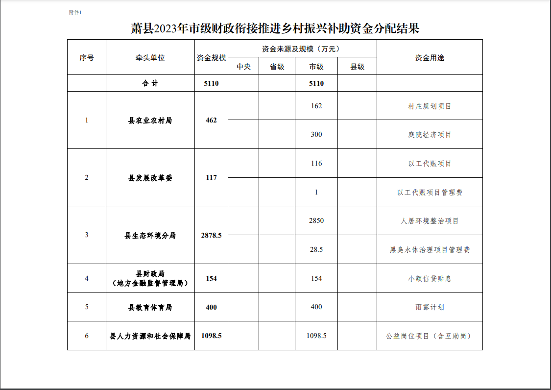 附件:蕭縣2023年市級(jí)財(cái)政銜接推進(jìn)鄉(xiāng)村振興補(bǔ)助資金分配結(jié)果