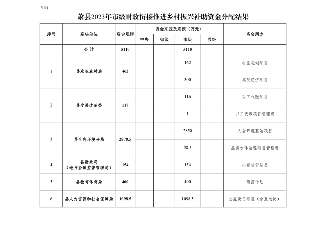 蕭縣2023年市級財(cái)政銜接推進(jìn)鄉(xiāng)村振興補(bǔ)助資金分配方案已經(jīng)縣委農(nóng)村工作領(lǐng)導(dǎo)小組會議審定、批復(fù)下達(dá),參照原安徽省扶貧辦、安徽省財(cái)政廳《關(guān)于完善扶貧項(xiàng)目資金公告公示制度的實(shí)施意見》(皖扶辦〔2018〕118號)精神,現(xiàn)將資金分配結(jié)果公告如下: