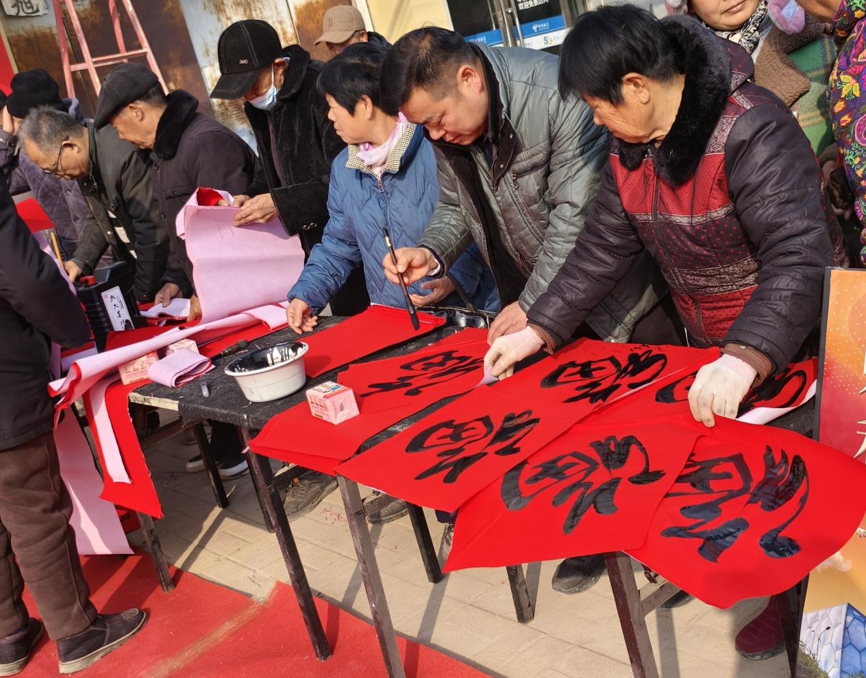 “千門萬(wàn)戶曈曈日,總把新桃換舊符?!辟N春聯(lián)作為我國(guó)春節(jié)的傳統(tǒng)習(xí)俗,寓意著辭舊迎新、祈福納祥。活動(dòng)現(xiàn)場(chǎng),紅紙鋪展,墨香四溢,書法老師們揮毫潑墨,一副副散發(fā)著清新墨香的春聯(lián)和“?!弊周S然紙上。村民們圍聚在桌旁,紛紛挑選自己心儀的春聯(lián)和“?!弊帧?/p>