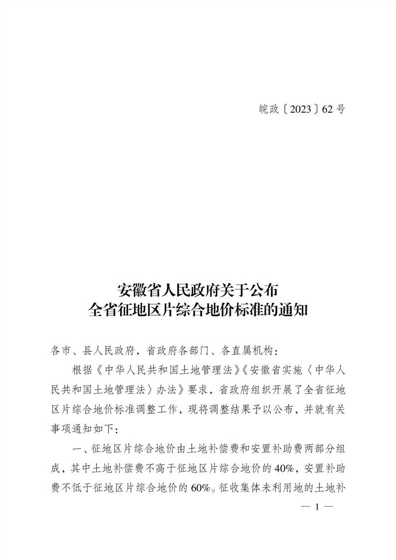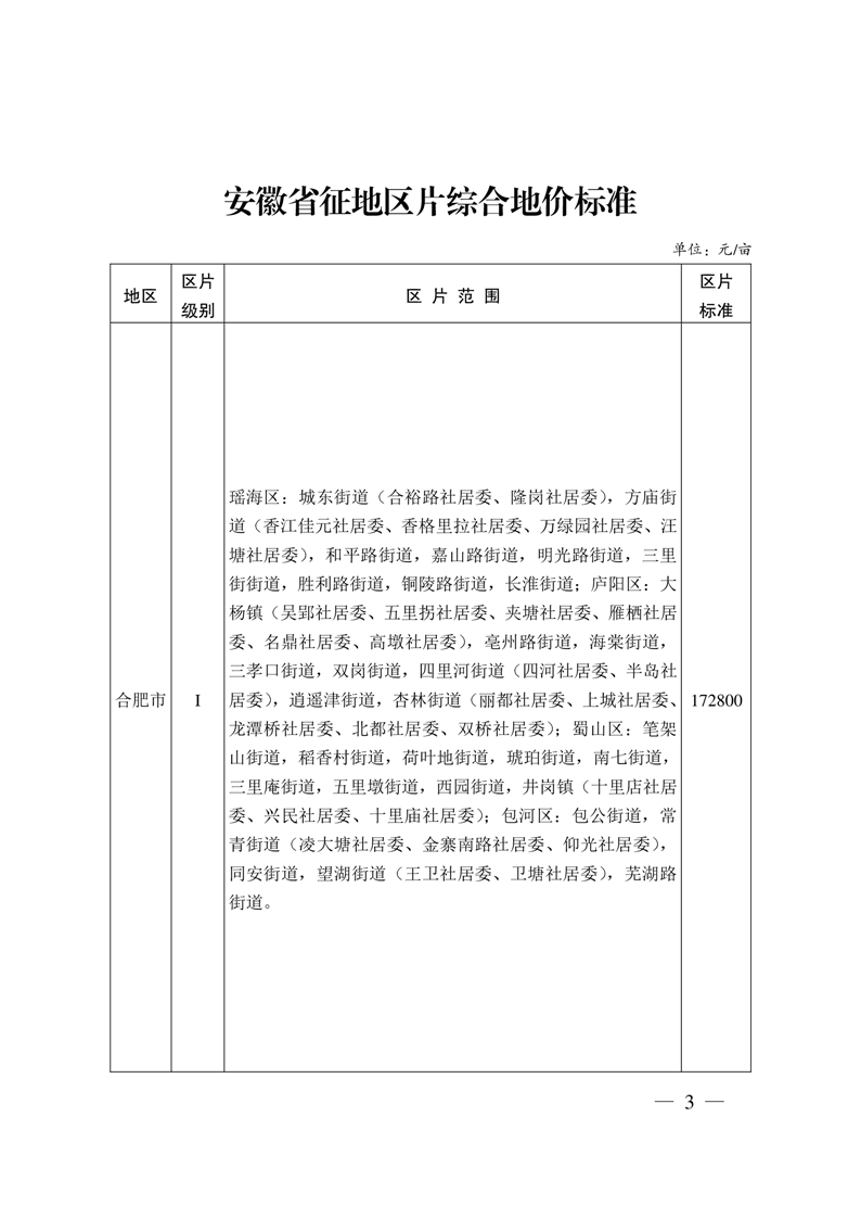 安徽省人民政府關于公布全省征地片區(qū)綜合地價標準的通知