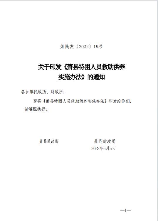 【政策文件】關(guān)于印發(fā)《蕭縣特困人員救助供養(yǎng)實施辦法》的通知(蕭民發(fā)【2022】19號)