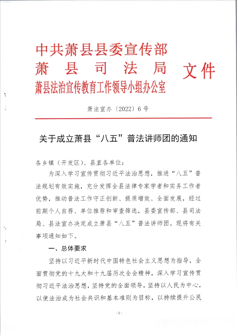 【普法講師團】關于成立蕭縣“八五”普法講師團的通知