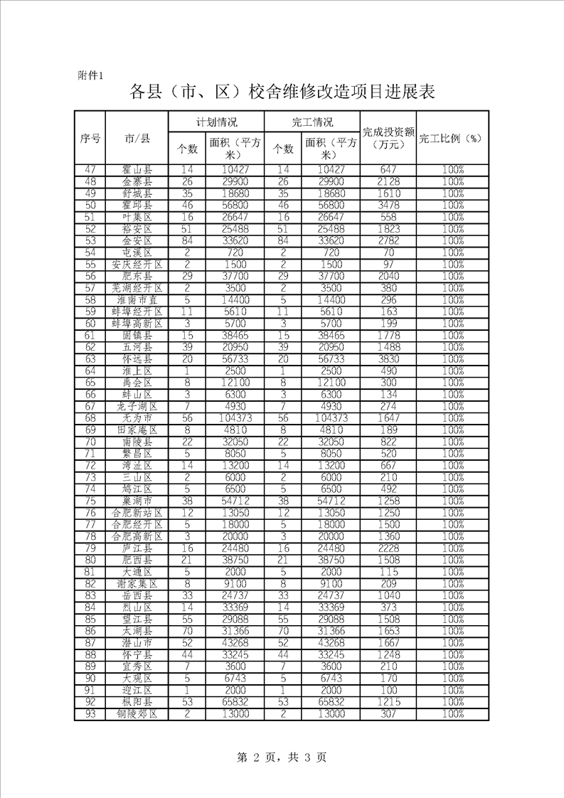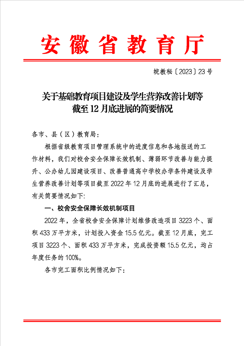 安徽省教育廳關(guān)于基礎(chǔ)教育項(xiàng)目建設(shè)及學(xué)生營(yíng)養(yǎng)改善計(jì)劃等截至12月底進(jìn)展的簡(jiǎn)要情況