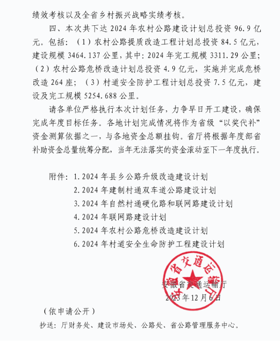 安徽省交通運(yùn)輸廳股下達(dá)2024年農(nóng)村公路建設(shè)計(jì)劃的通知
