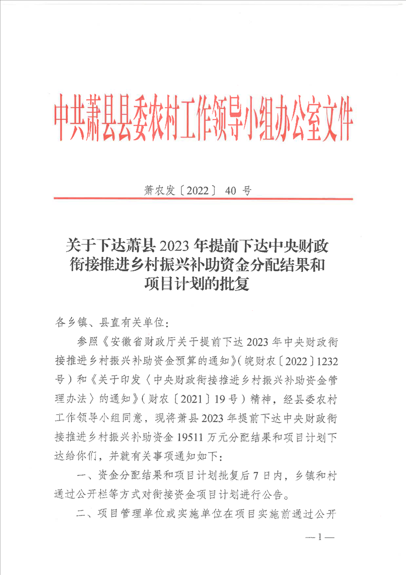 關(guān)于下達(dá)蕭縣2023年提前下達(dá)中央財(cái)政銜接推進(jìn)鄉(xiāng)村振興補(bǔ)助資金項(xiàng)目的批復(fù)