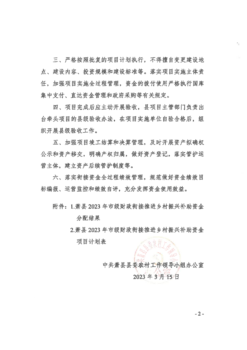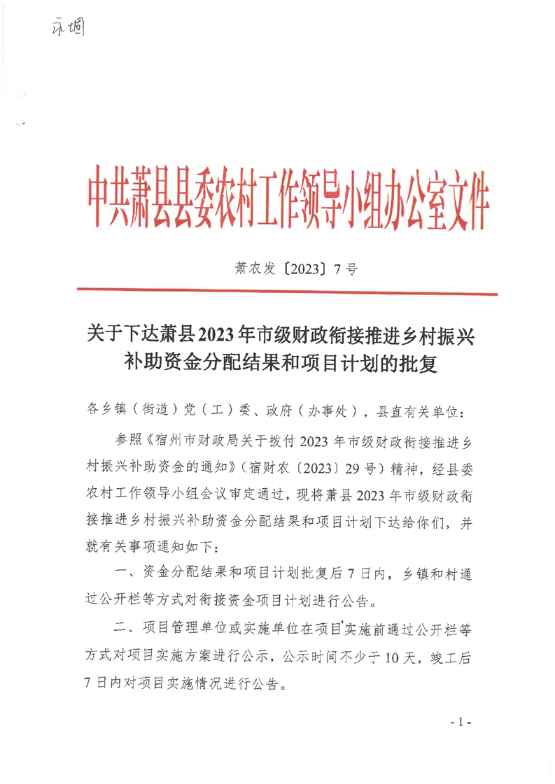 關(guān)于下達(dá)蕭縣2023年市級(jí)財(cái)政銜接推進(jìn)鄉(xiāng)村振興補(bǔ)助資金分配結(jié)果和項(xiàng)目計(jì)劃的批復(fù)