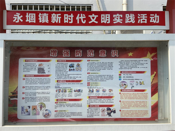 聚焦新矩陣,打造“一墻一窗”新陣地。走進永堌鎮(zhèn)文化廣場,在廣場左邊看到的“一墻一窗”令人眼前一亮,配上生動形象的反邪教漫畫、插畫等形式有利于群眾更好地吸收知識,以寓教于樂的形式深化群眾反邪意識,營造文明健康、崇尚科學的良好風氣;同時,結(jié)合秸稈禁燒、群眾說事日宣傳“一墻一窗”,既讓群眾能夠知曉,又能夠以潛移默化、耳濡目染的方式增強反邪能力。